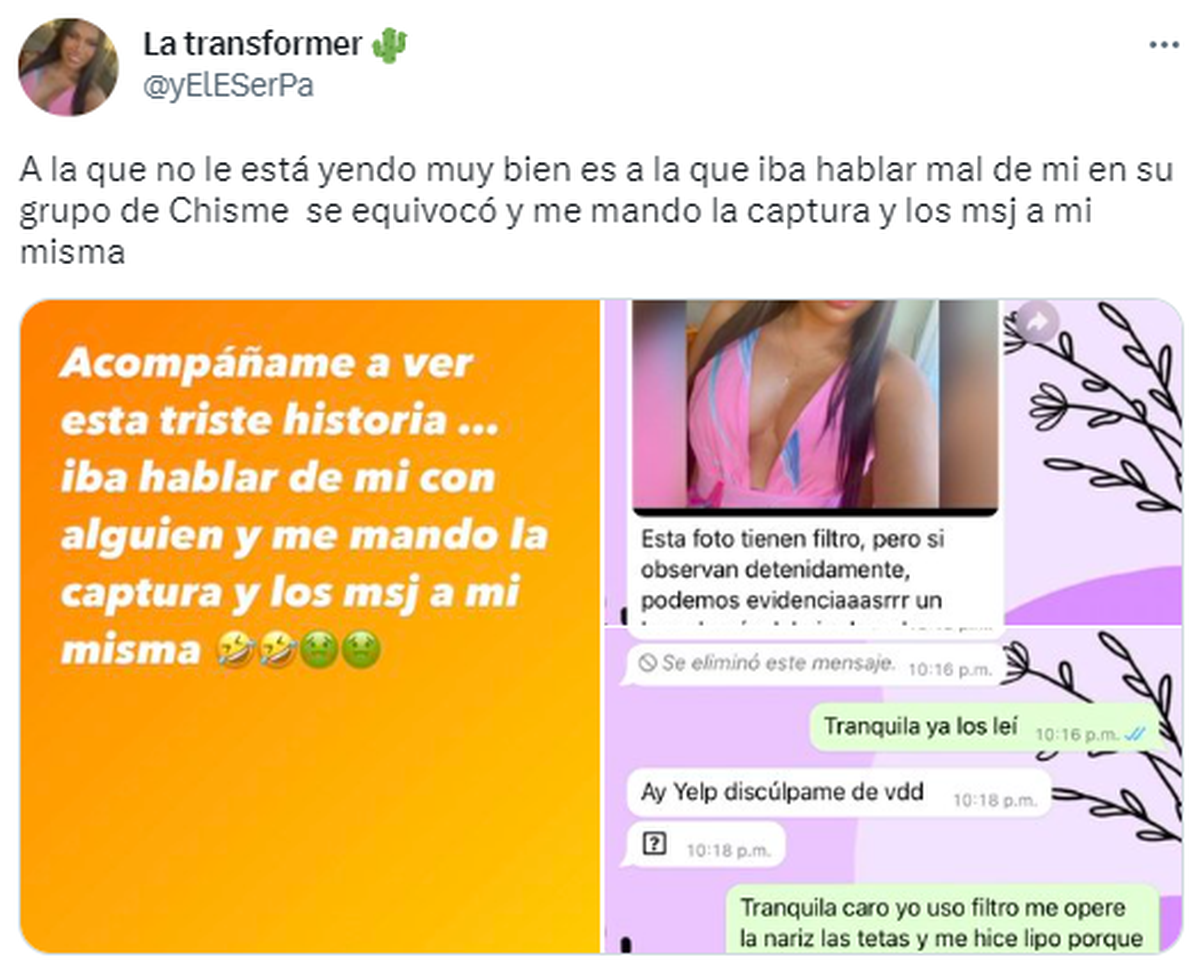 A través de una publicación que se hizo viral entre los usuarios de Twitter, la cuenta de "La Transformer" causó revuelo con una situación realmente insólita que le tocó vivir mientras estaba tranquila con su celular. Resulta que una chica capturó la foto de la protagonista y le criticó varios aspectos físicos, pero en vez de mandárselo a sus amigas para burlarse, se lo mandó a ella: "Perdón, de verdad".