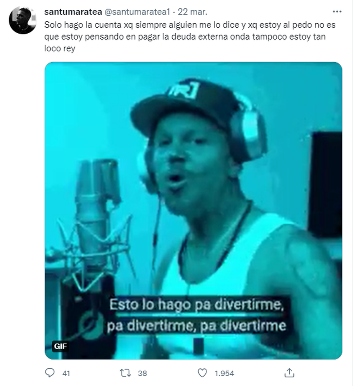 "Solo hago la cuenta porque siempre alguien me lo dice y porque estoy al pedo, no es que estoy pensando en pagar la deuda externa. Onda tampoco estoy tan loco, rey", escribió junto a GIF de Residente cantando "esto lo hago, pa divertirme, pa divertirme" en la Sessions #49 con Bizarrap.