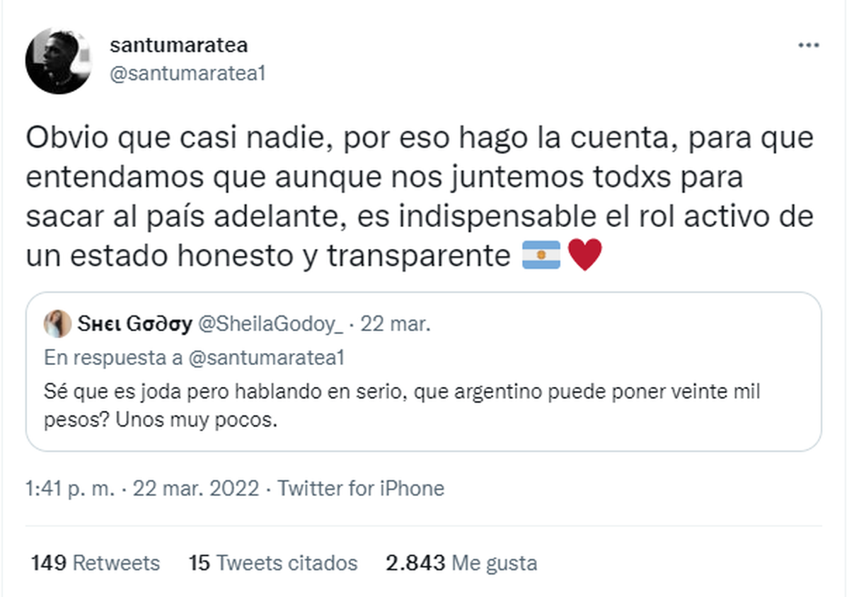 Para dar finalizado el tema y tras el comentario de un usuario de Twitter, que le preguntó "qué argentino puede poner 20 mil pesos", Santi Maratea comentó: "Obvio que casi nadie, por eso hago la cuenta, para que entendamos que aunque nos juntemos todxs para sacar al país adelante, es indispensable el rol activo de un Estado honesto y transparente".