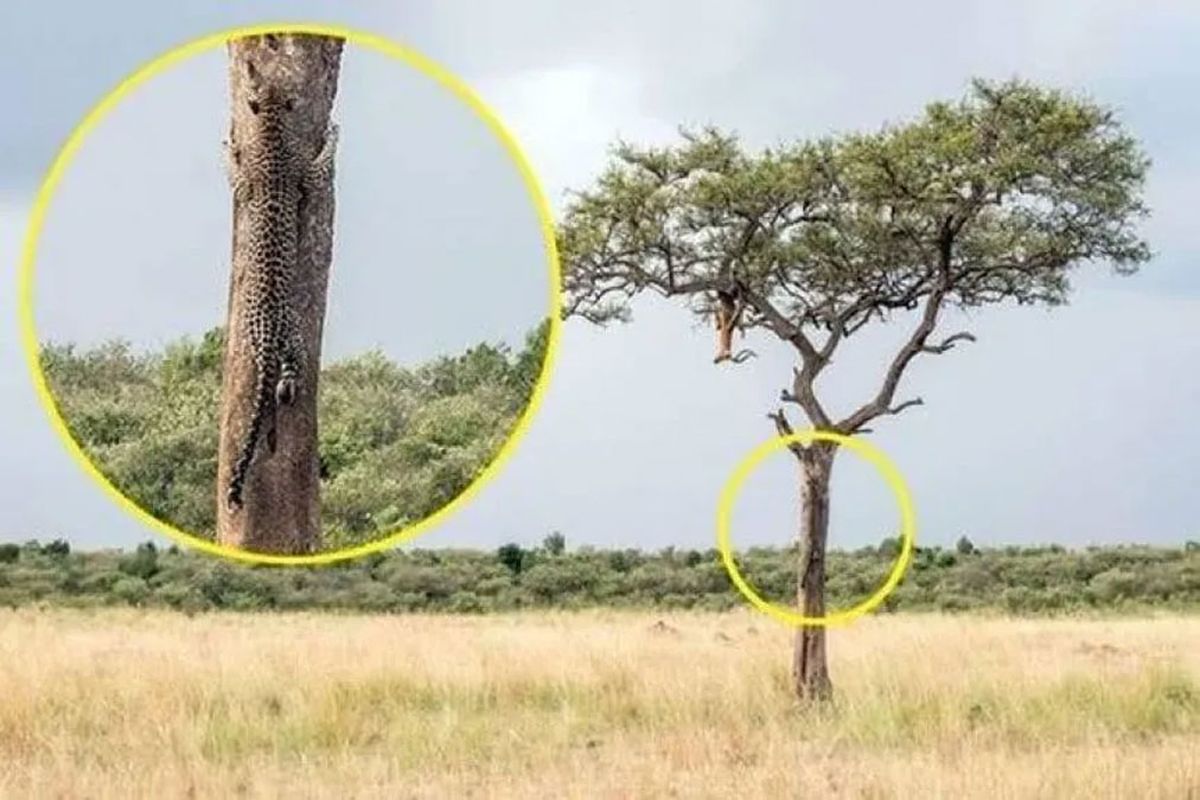 ¿Te cansaste de buscar y no lograste hallar al lindo LEOPARDO en el paisaje? Ya es hora de que revises cuál es la solución del acertijo visual. Fiel a su costumbre, el animal justo está OCULTO en el tronco del árbol, en plena trepada.