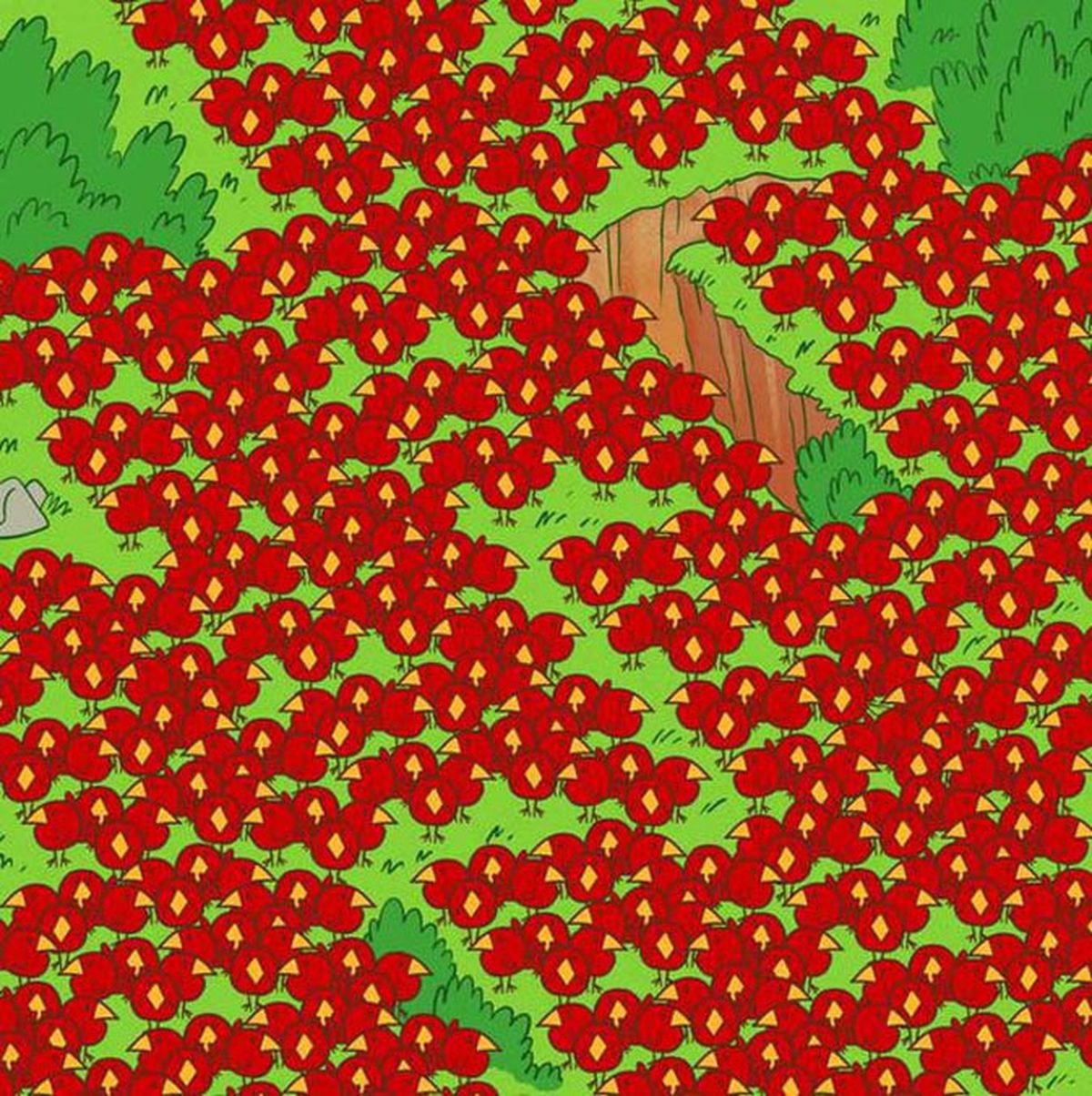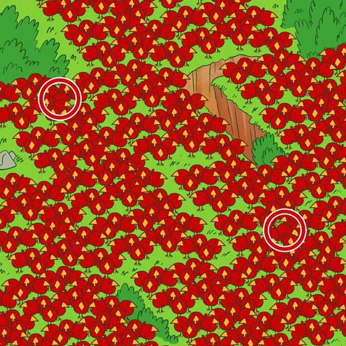 En este acertijo visual, los más más sabios podrán hallar las MANZANAS, en una imagen que muestra muchos pájaros color rojo y pico amarillo.