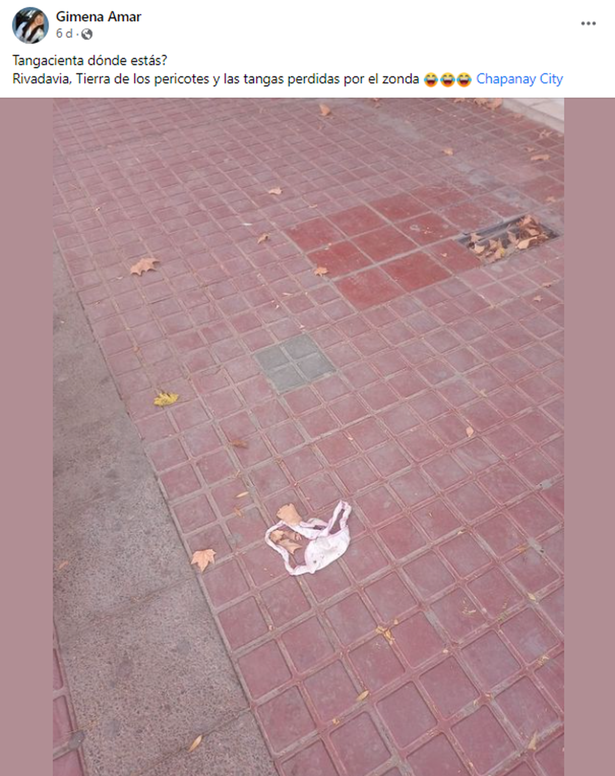 Un posteo revolucionó el inicio de Facebook de las cuentas de Mendoza, y es que Gimena Amar hizo una especie de llamado de solidaridad, para encontrar a una chica que perdió algo preciado culpa del viento Zonda. En las calles de Rivadavia, la joven se encontró con una tanga rosada tirada en la vereda y comenzó la búsqueda de "tangacienta": "Tierra de los pericotes y las tangas perdidas por el zonda".