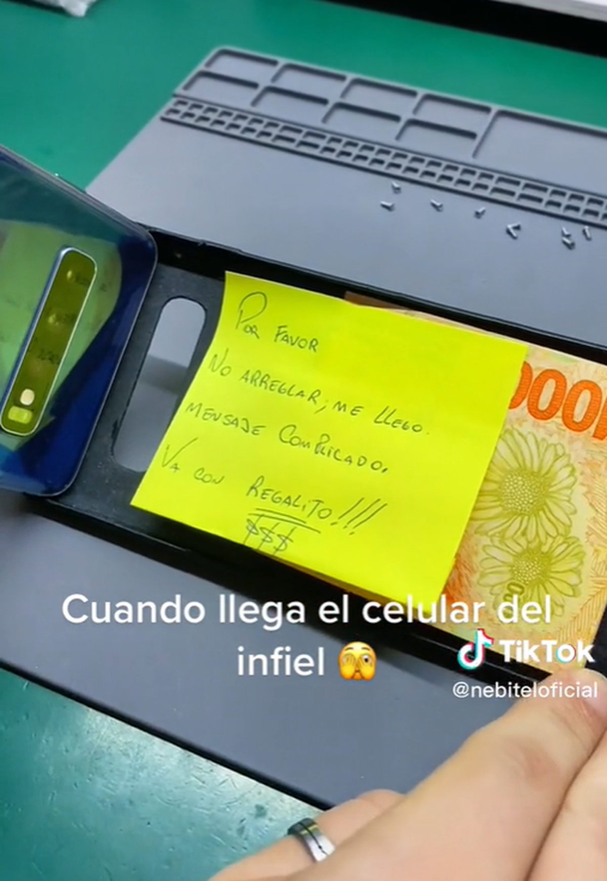 "Por favor, no arreglar. Me llegó un mensaje complicado. Va con regalo" se podía leer en un papelito color amarillo, que venía acompañado con otra sorpresa para quien debía arreglar el celular: un billete de mil pesos.
