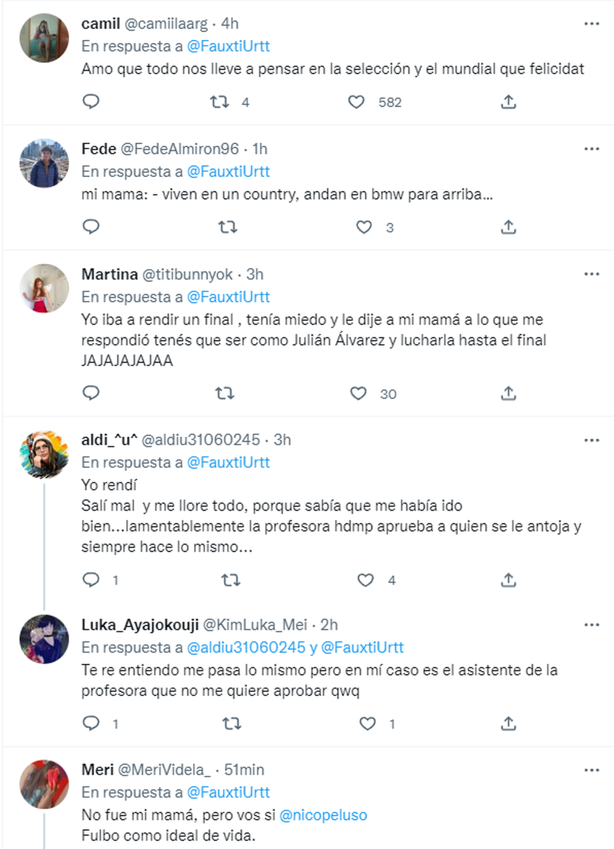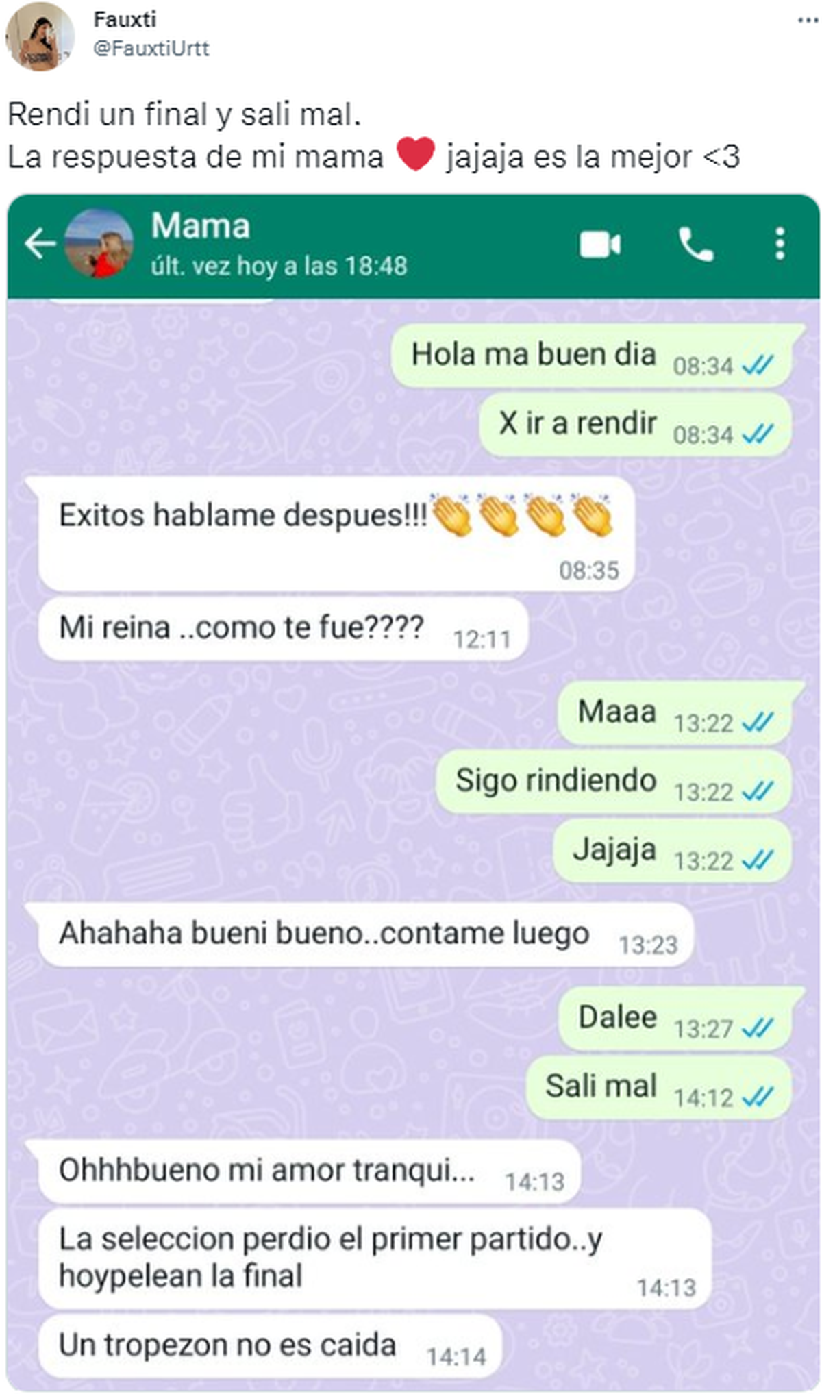 Lamentablemente para la usuaria de Twitter, no logró aprobar y no quedó otra que avisarle a su madre que no todo salió como esperaba. Aprovechando esta "manija" que se ha generado por la Selección argentina, la mujer aprovechó para recordar un partido del equipo en el Mundial Qatar 2022, y así motivarla a que siga intentando: "Bueno, tranqui amor. La selección perdió el primer partido y hoy pelean por la final. Un tropezón no es caída".