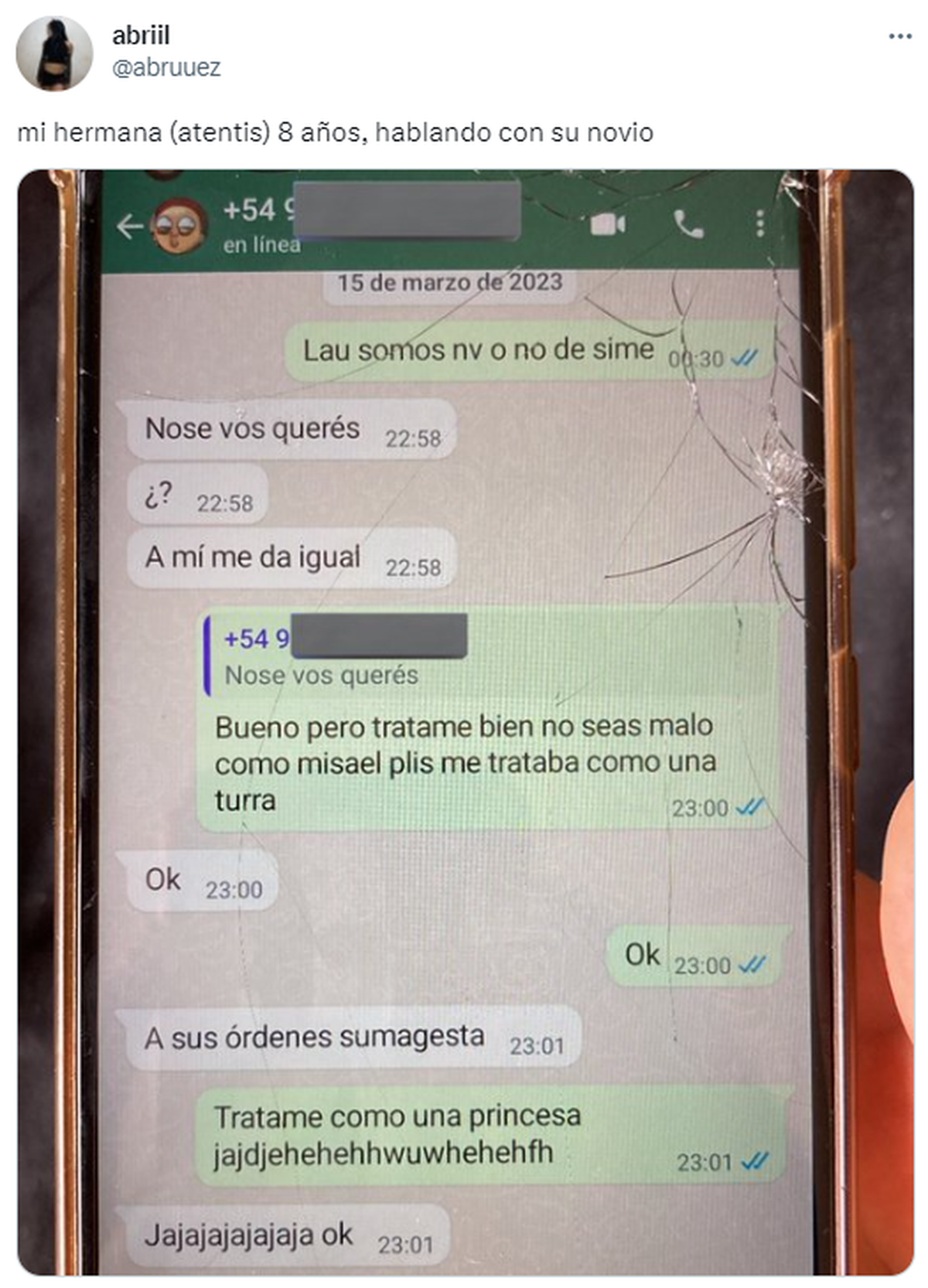 Una usuaria de Twitter se hizo viral entre las cuentas de la red de pajarito azul luego de compartir la inocente conversación entre su hermanita de 8 años y su compañero de la misma edad con quien decidió "ponerse de novio". En la captura de la charla de WhatsApp se ve como la niña tiene muy en claro como quiere ser tratada por su parejita, y sin darle vueltas se lo dejó en claro: “Tratame como una princesa”.