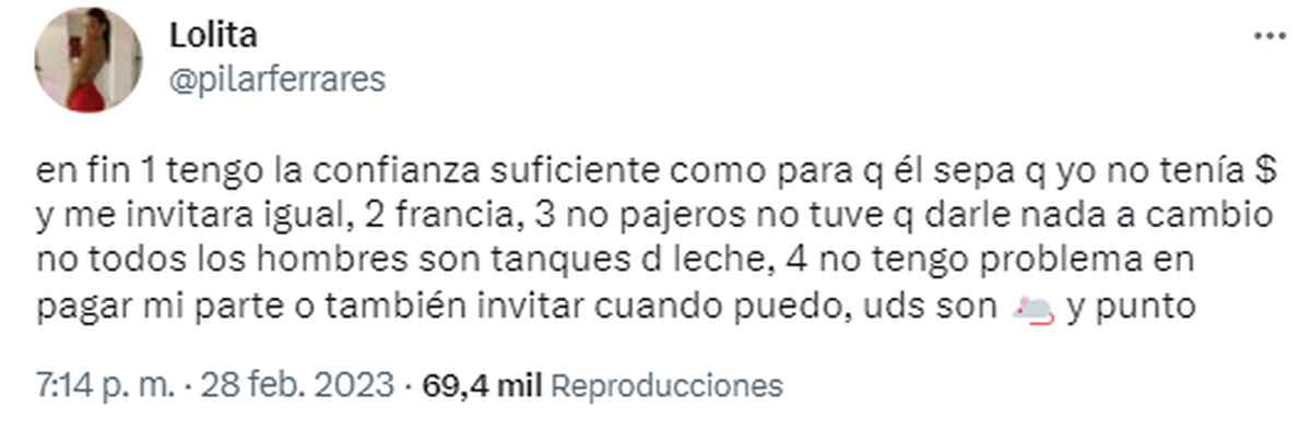Cansada por varias de las críticas que recibió en el posteo viral de Twitter y que la trataran de "soga", la chica de Mendoza salió a aclarar lo sucedido: "en fin 1 tengo la confianza suficiente como para q él sepa q yo no tenía $ y me invitara igual, 2 francia, 3 no pajeros no tuve q darle nada a cambio no todos los hombres son tanques d leche, 4 no tengo problema en pagar mi parte o también invitar cuando puedo, uds son y punto".