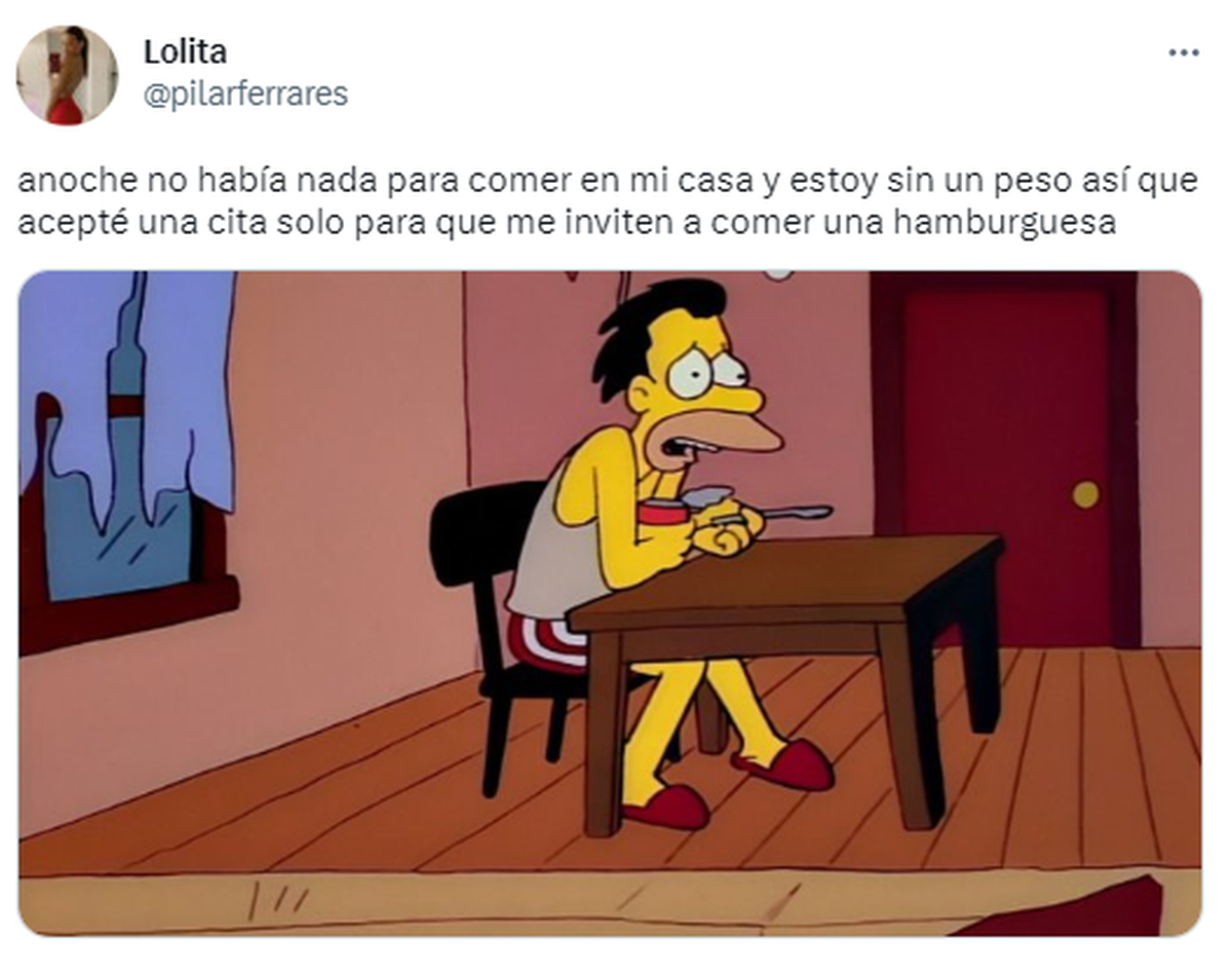 Acompañada por una imagen del personaje de Los Simpson, Lenny, en la escena que pide que no cuenten como vive, la chica de Mendoza hizo una confesión que se volvió viral: "anoche no había nada para comer en mi casa y estoy sin un peso así que acepté una cita solo para que me inviten a comer una hamburguesa". Con su posteo, la joven llegó a recolectar más de 70 mil "me gusta", y sobre todo, varias invitaciones más para ir a cenar.