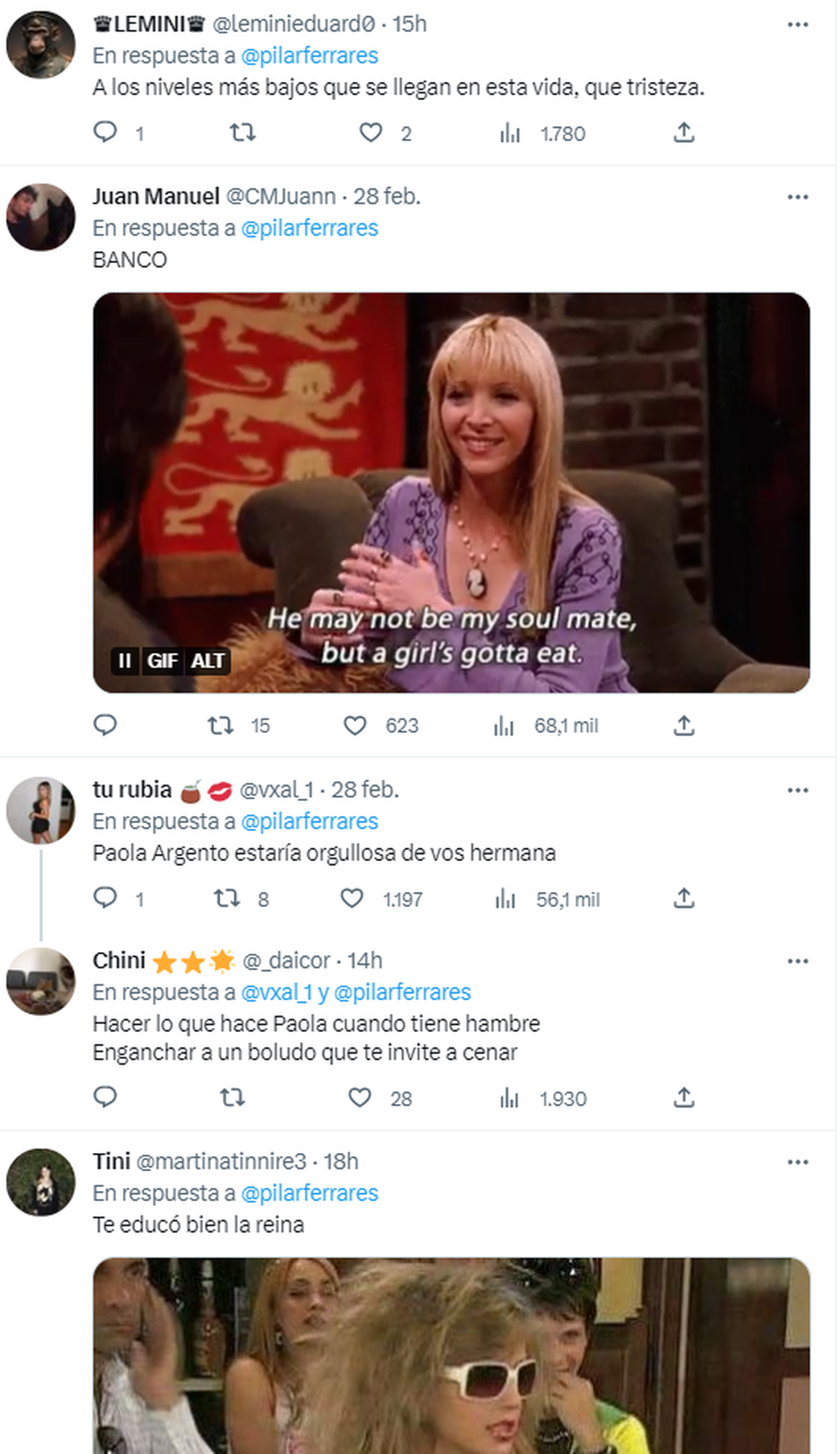 A través de una publicación que se hizo viral entre las cuentas de Twitter, la chica de Mendoza Pilar Ferrares confesó algo a lo que tuvo que acudir para poder comer, dado a que no tenía mucha plata en los días de fin de mes, donde todo cuesta el doble. Para no tener que gastar el dinero con el que no contaba, la chica le aceptó una cita a un joven que sabía que le iba a invitar la cena: "anoche no había nada para comer en mi casa".