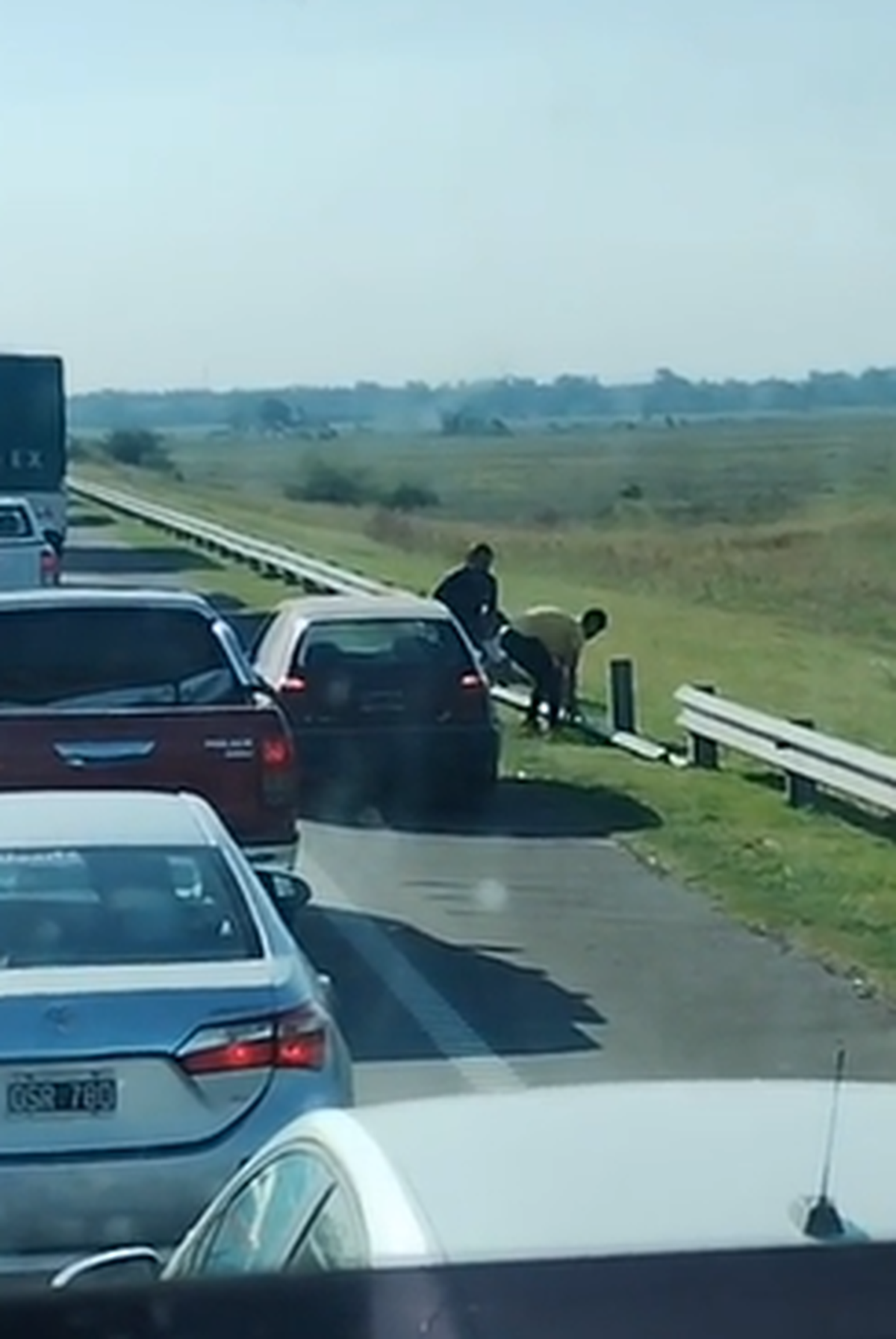 En un momento del video, se ve como los conductores de algunos vehículos comienzan a patear uno de los guardarraíl, intentando sacarlo de su soporte y de esa manera poder tomar el camino libre que estaba a tan solo algunos metros de donde estaban parados: "¿Qué querés hacer enfermo? Dejate de joder, estamos todos enfermos. Después se quejan de nuestras rutas".