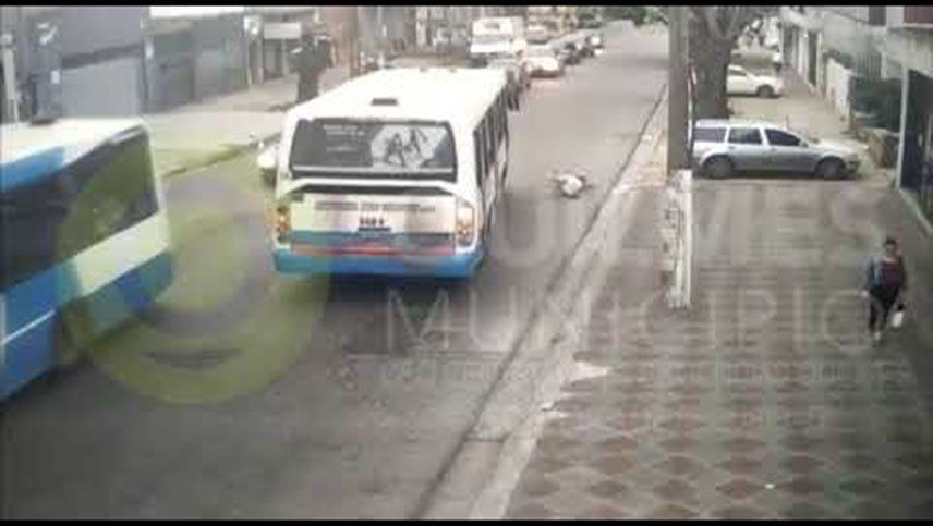 El ciclista circulaba en la calle perdió el control de su pequeño vehículo y terminó impactando contra el asfalto en el momento exacto en el que un colectivo pasaba por el lugar. Afortunadamente, el chofer del transporte advirtió la desesperante situación y logró evitar pasar sobre la víctima aplicando una peligrosa maniobra.