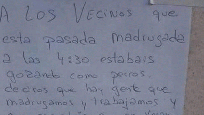 Hay mil y un historias que se podrían contar, y muchas de ellas, por suerte para el resto, llegan a las redes sociales. La última nos llega de España, de la mano de la cuenta de Twitter Líos de Vecinos, que publicó una imagen en la que se ve un cartel colgado por el vecino de un edificio que se quejaba de una pareja vecina por el exceso de ruido a la hora de practicar sexo.