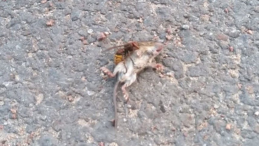 Una avispa asiática, también conocida como avispón asesino fue filmada en el momento justo que mató un ratón. El video es impresionante por la fuerza que muestra el insecto contra el roedor.